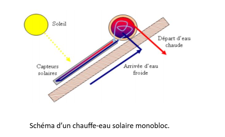 Relie les capteurs et le ballon dans un seul composant (Figure1), son fonctionnement est autonome et son installation très simple. En effet, il suffit de brancher l'alimentation de l'eau froide et connecter le départ de l'eau chaude à un robinet. C'est le chauffe eau solaire le moins cher et un grand nombre sont utilisés à travers le monde. Les inconvénients sont dus au ballon qui reste dehors avec les capteurs : Les pertes thermiques peuvent être importantes et son intégration architecturale est plus difficile, il est particulièrement adapté à une usage en été.
